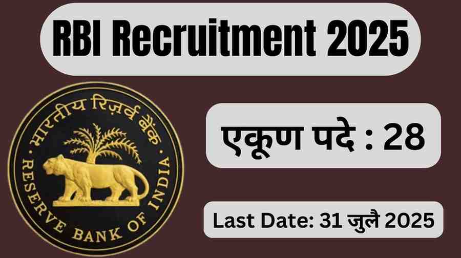 RBI Bharti 2025 : भारतीय रिझर्व्ह बँक (RBI) मार्फत विविध पदांसाठी भरती जाहीर करण्यात आली आहे. या अंतर्गत Legal Officer, Manager (Civil/Electrical), Assistant Manager (Rajbhasha/Protocol & Security) अशा 28 पदांची भरती केली जाणार आहे. इच्छुक उमेदवारांनी 31 जुलै 2025 पर्यंत Online अर्ज करावा. अधिक माहितीसाठी अधिकृत जाहिरात (PDF) पहा.
